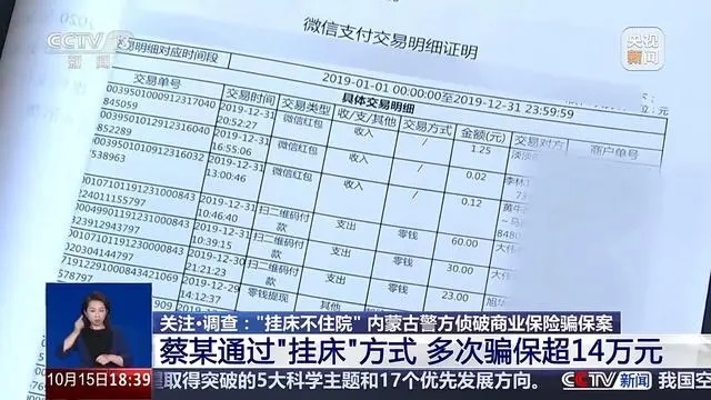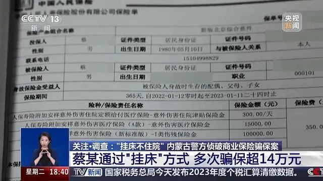 经民警调查,投保人蔡某2022年多次住院治疗报销,每次住院长达40天,并且他本人也在多家保险公司上了意外保险,蔡某住院期间每天在村小卖部和其他地点有多笔消费记录,左邻右舍反映蔡某并未住院治疗,而是谎称受伤在医院挂了床位。